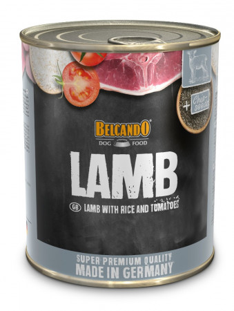 Carne, panza, hígado, corazón y pulmón de cordero (63 %); caldo de carne de cordero (26,5 %); arroz cocido (4 %); tomates (4 %); semillas de chía (1 %); cáscaras de huevo secas (0,5 %); minerales (0,5 %); aceite de cardo (0,5 %)