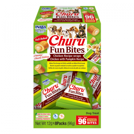 Churu Fun Bites es un snack delicioso y saludable para perros, elaborado con ingredientes de alta calidad como pollo criado en granjas y/o atún salvaje natural. Cada bocado en forma de pequeña almohada ofrece una doble textura: una suave envoltura de pasta de pollo horneada sin cereales, conservantes, ni colorantes artificiales, y un interior relleno con la deliciosa crema Churu. Con un 69 % de humedad para mayor hidratación y solo 18 kcal por paquete, es un snack bajo en calorías que cuida la salud de los perros. Además, contiene vitamina E y antioxidantes gracias al extracto de té verde. Cada caja de Churu Fun Bites incluye 8 prácticos paquetes, cada uno con aproximadamente 12 piezas.