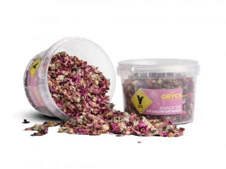 Alimento complementario para conejos y roedores. Snack 100% natural. Contribuye a la mejora del tránsito intestinal y actúa como antioxidante y relajante. Administrar un máximo de 7-10 gramos diarios. 100% rosa. Grasa 1,2%, proteína 9%, fibra 19%,