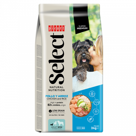 Picart Select MINI ADULT con pollo y arroz está formulado para satisfacer todas las necesidades de tu perro y promover una condición física y salud óptimas. El pollo, como única fuente de proteína animal, le aporta proteínas de alto valor biológico.