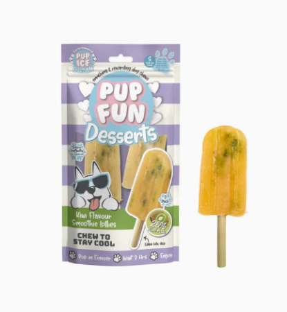Pup Fun es un divertido snack masticable para perros pequeños con forma de polo y con kiwi en su interior, ideal para refrescar y entretener a tu perro durante más tiempo.